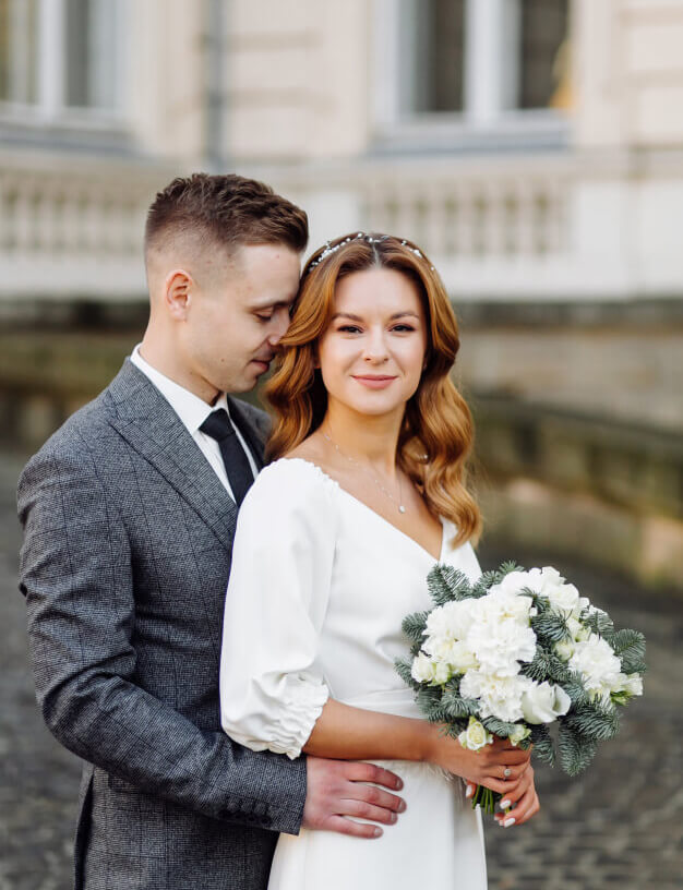 “During a sunny Sunday morning picnic at the Liberty Memorial, David shocked Kate by dropping to one knee and telling her he wanted to spend the rest of his life with her. With no ring in hand, he told her to turn around, where she found their best friends standing with signs reading, “Will you marry me?” Then, the pair’s puppy, Wasabi, made his grand entrance in a mini tux with a ring box around his neck. “Somewhere during all the hugging and crying, a sparkling ring ended up on my left hand and a dozen red roses in my right,” Kate says.”